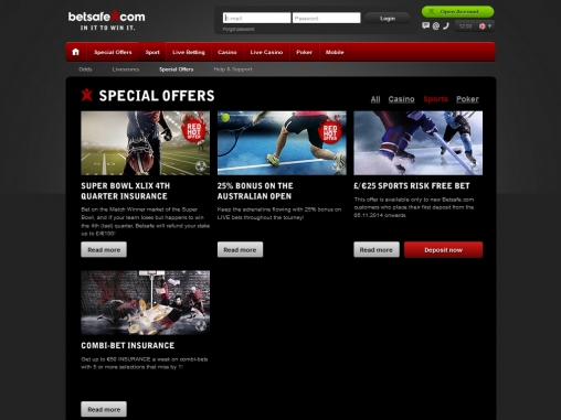 Темно-серый фон и красные элементы дизайна – это очень удачное сочетание, которые всегда выглядит стильно и эффектно. Также хочется отметить простой и в то же время запоминающийся логотип BetSafe и броский слоган “Win on Almost Everything” («Выигрывай почти на всем»).