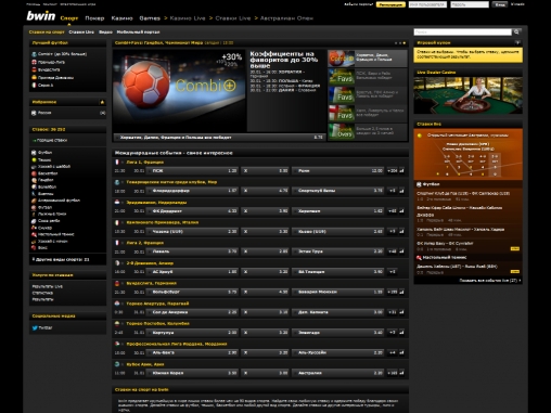 Дизайн bwin очень строгий: темно-серый фон, белые простые шрифты, почти полное отсутствие рекламных баннеров. Оживляют картинку немногочисленные желтые элементы дизайна. Что касается структуры сайта – здесь все на высшем уровне. Пользоваться ним комфортно, несмотря на множество разделов, подразделов и страниц.