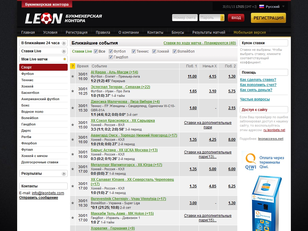 В Leonbets принимаются ставки различных типов на такие виды спорта, как футбол, хоккей, теннис, автоспорт, баскетбол, гандбол, волейбол, регби, дартс, хоккей с мячом, флорбол. Также можно делать долгосрочные ставки (например, на победителя чемпионата) и ставки в режиме Live.