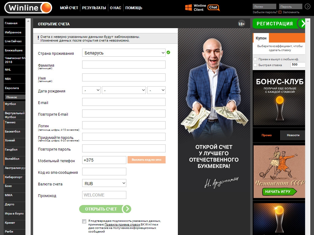 Чтобы делать ставки в БК «Винлайн», необходимо зарегистрироваться на сайте, заполнив анкету и пройти верификацию в офисе партнера ЦУПИС. Это разовая процедура, не требующая повторения.