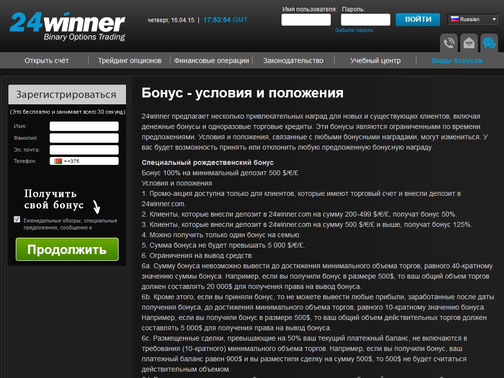 Рождественский бонус доступен для получения всем клиентам 24winner. Он равен 125% от суммы денежных средств, внесенных на торговый счет. Минимальная сумма, на которую начисляется бонус, равна 500 долларам. Условия получения рождественского бонуса аналогичны тем, которые выставляет 24winner по бонусы на первый депозит.