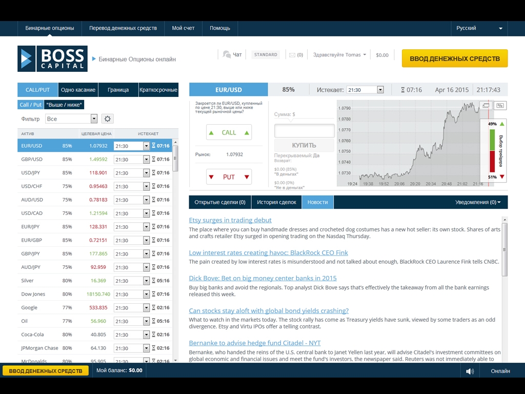 2. Начало торговли бинарными опционами на платформе Bosscapital: