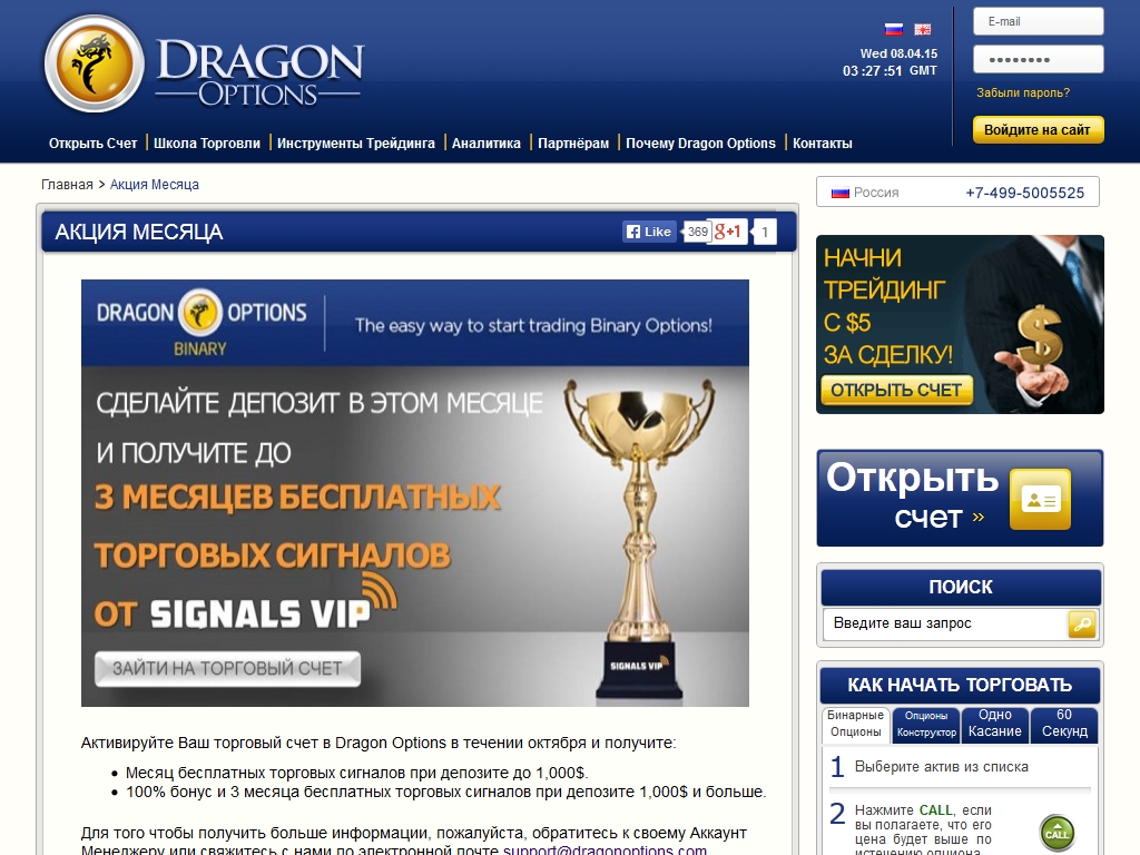Все клиенты могут участвовать в различных акциях проводимых Dragon Options, и выигрывать отличные бонусы и денежные призы.