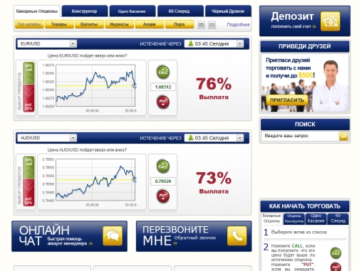 Порадовало наличие множества разных опционов, а не только обычные валютные пары, как у многих других площадок. Да и само оформление сайта на высоте, видно что организация серьезная, а не абы что.