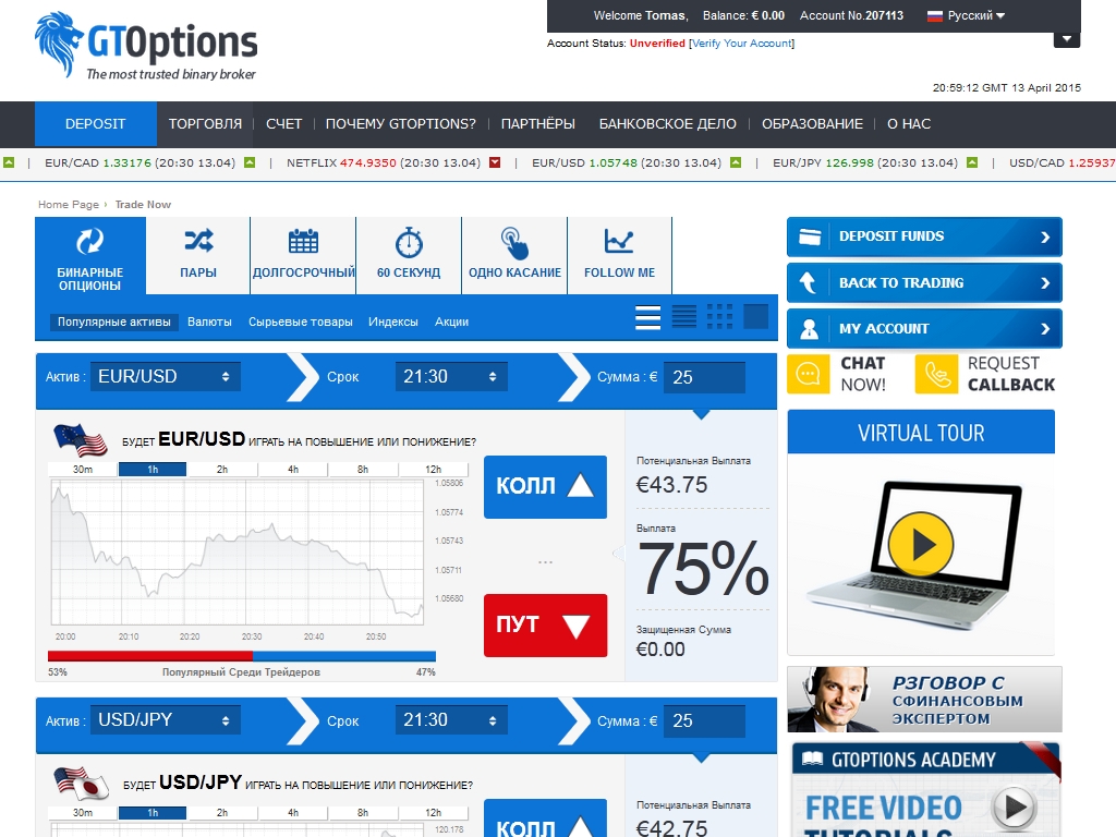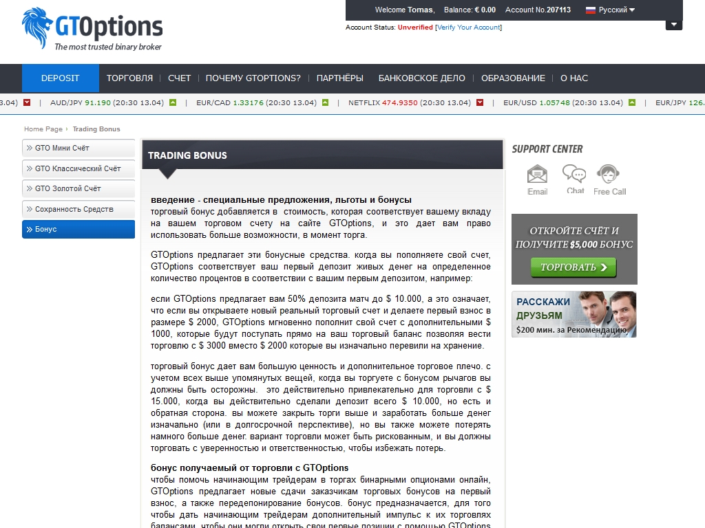 GTOptions отличная брокерская компания по торговле бинарными опционами!На сайте предоставлен хороший выбор обучающих материалов!Отличная бонусная политика множество акций направленных на поощрение своих клиентов!