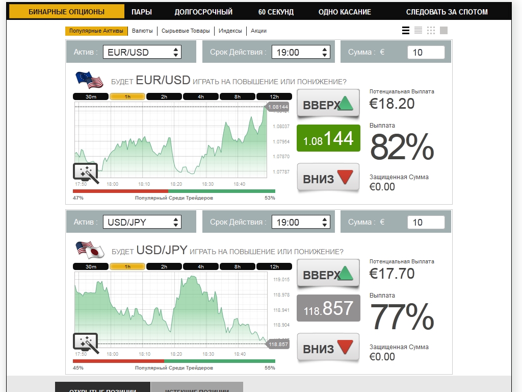Трейдеры имеют возможность на платформе выбирать для торговли самые разные активы, начиная от валютных пар и заканчивая нефтью. Для заключения сделок предлагаются самые популярные виды опционов.