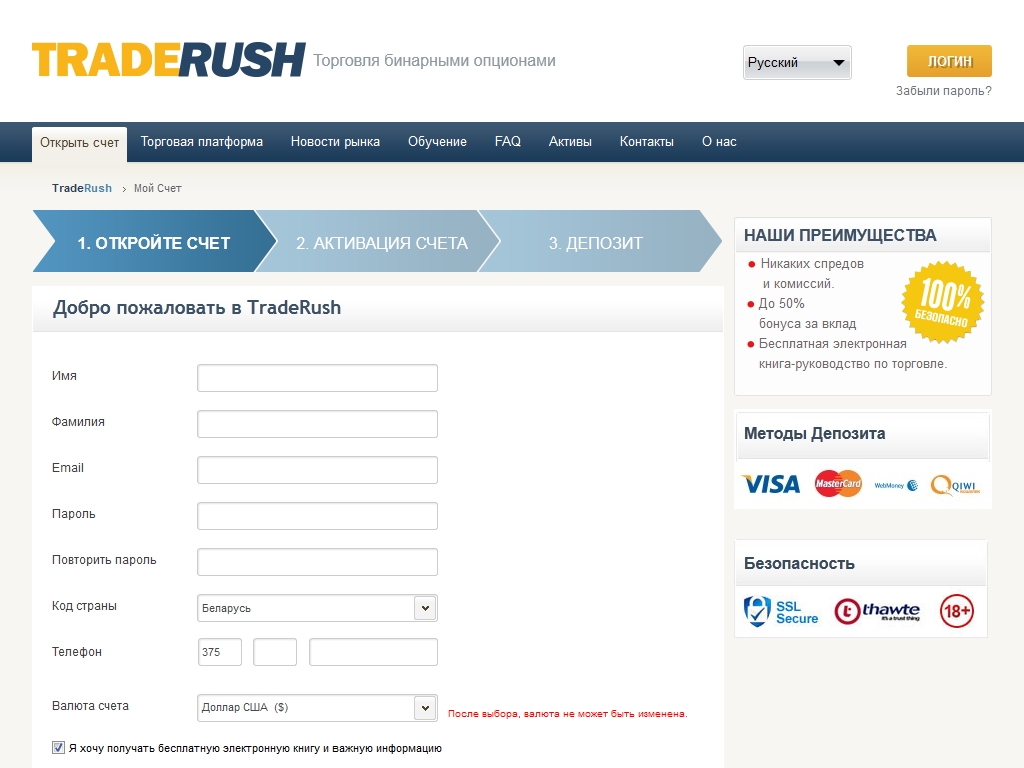 Открытие счета в TradeRush проходит в несколько этапов: