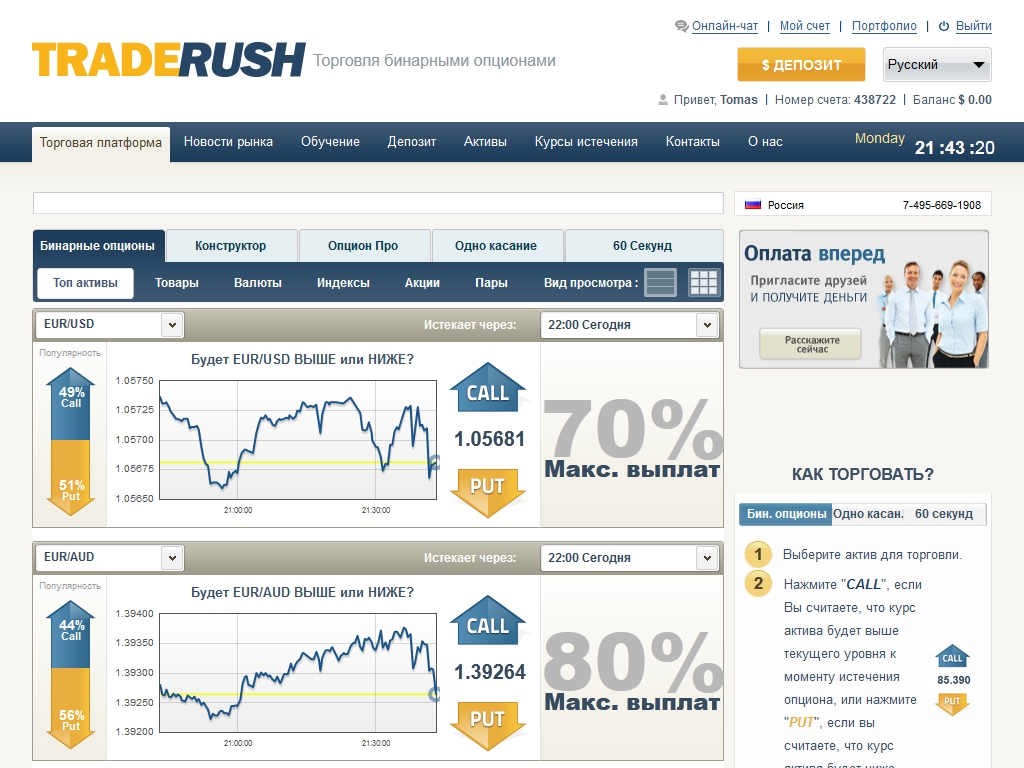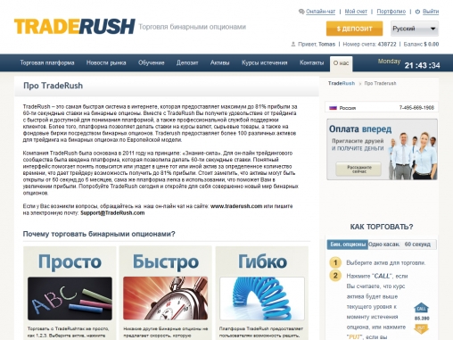 TradeRush предоставляет пользователям материал, по бинарным опционам, которые непосредственно повлияют на их дальнейшую прибыль в работе. Партнерскую программу,с высоким уровнем лояльности