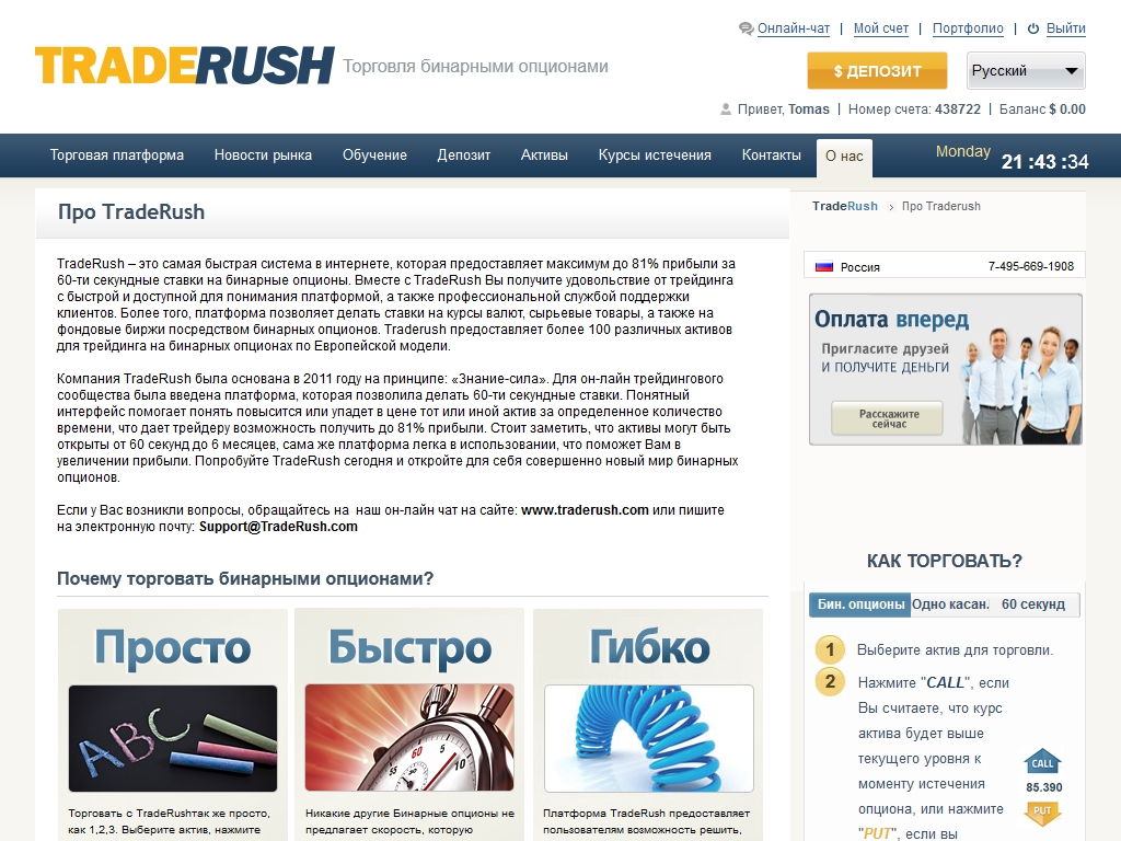 Компания TradeRush оказывает всестороннюю поддержку своим клиентам по всем вопросам по электронной почте Support@TradeRush.com, через онлайн-чат и по телефону +7(495)669-42-38.
