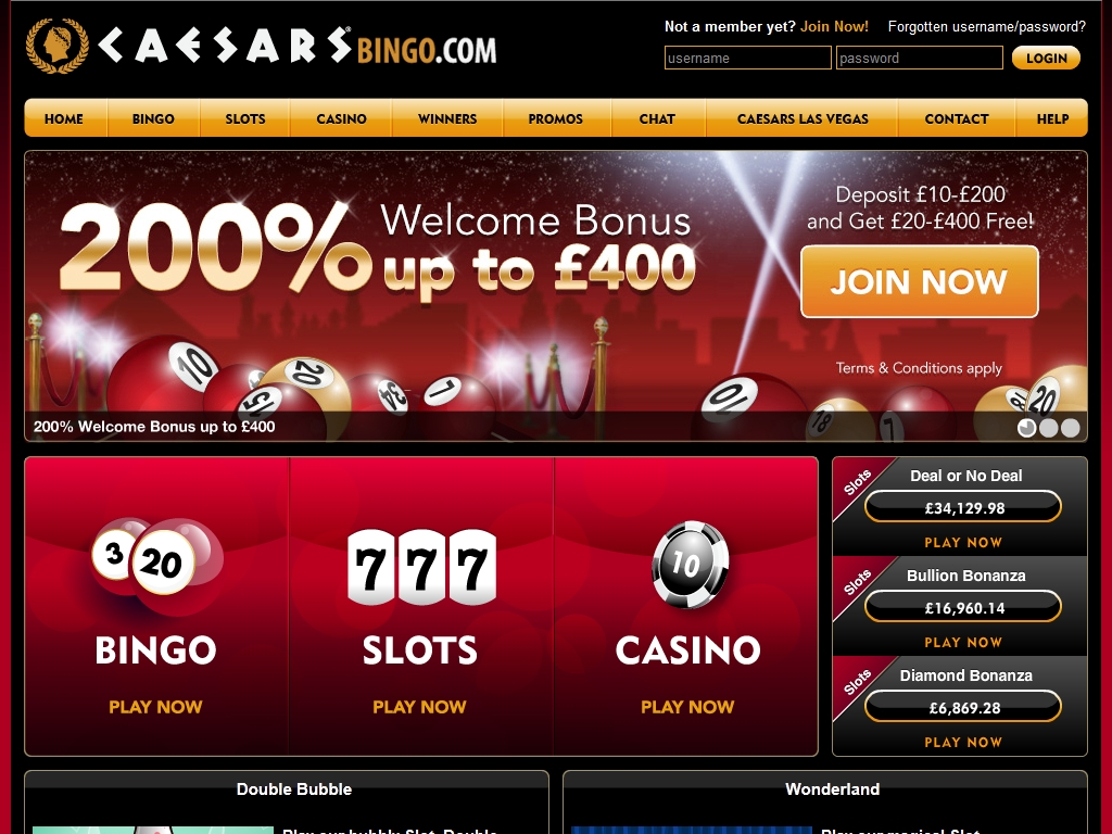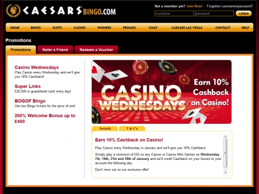 В Caesars Bingo действует обширная поощрительная программа для новых и постоянных клиентов. Зарегистрировавшись в бинго-холле и пополнив счет в первый раз, игрок получит 200% пригласительный бонус до 400 фунтов. На второй депозит начисляется 50% бонус до 100 фунтов. Условия их получения и отыгрыша уточняйте на сайте.