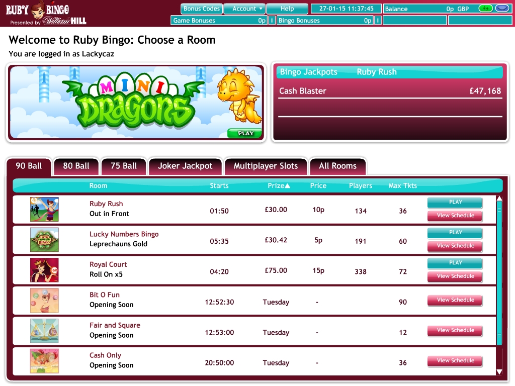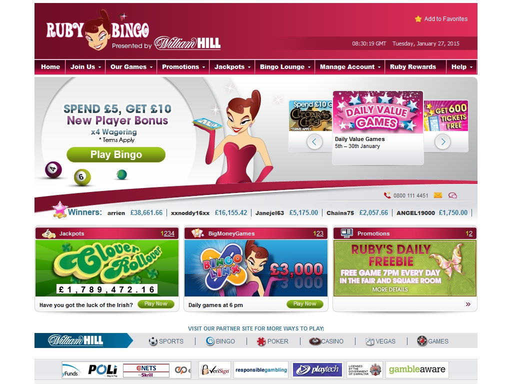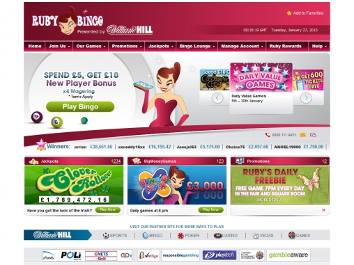 Знаменитый бренд William Hill, хорошо известный любителям онлайн-гемблинга во всех его проявлениях, представляет вашему вниманию красочный интернет бинго-холл Ruby Bingo. Здесь можно сыграть не только в бинго, но также в различные азартные игры казино.