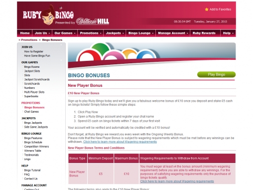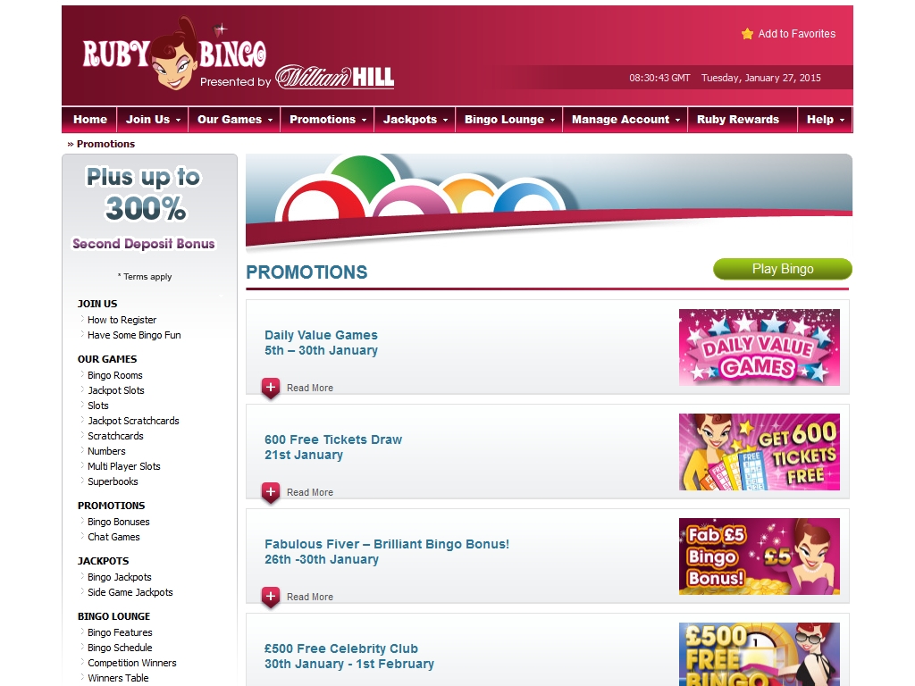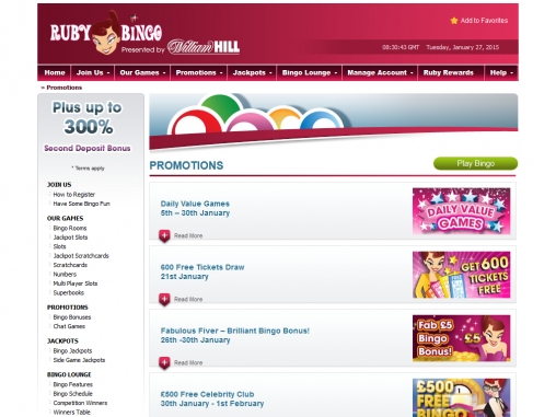 Бинго-холл Ruby Bingo может похвастаться множеством бонусов, акций, розыгрышей и других поощрительных предложений.