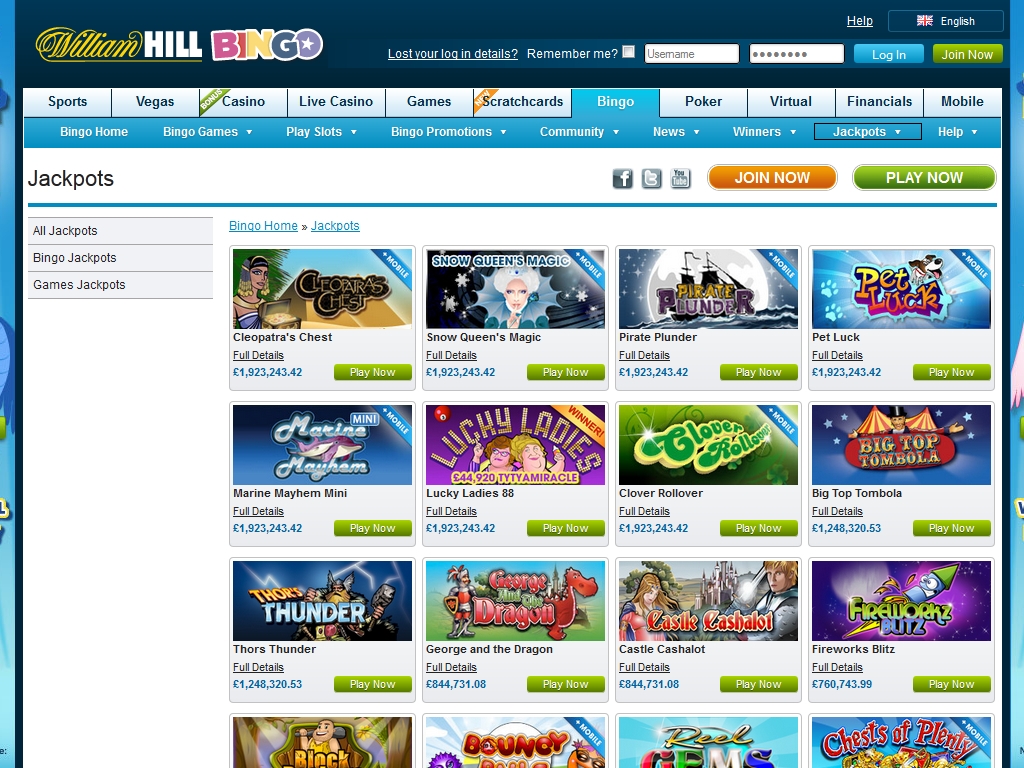 Помимо бинго, в William Hill Bingo представлены многочисленные видео-слоты, скрэтч-карты, развлекательные и акардные азартные игры, блэкджек, рулетка, кено и другие. В нескольких слотах и моментальных лотереях разыгрываются прогрессивные джек-поты. Испытывать игры William Hill Bingo можно в тренировочном режиме.