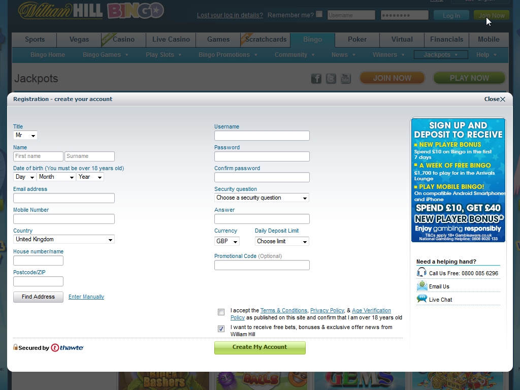 Для клиентов William Hill Bingo предусмотрены многочисленные поощрения в виде бонусов и акций. Новые пользователи, которые в течение первой недели игры потратили от десяти фунтов (или других денежных единиц) на билеты бинго, автоматически становятся обладателями бонуса в размере двадцати пяти фунтов.