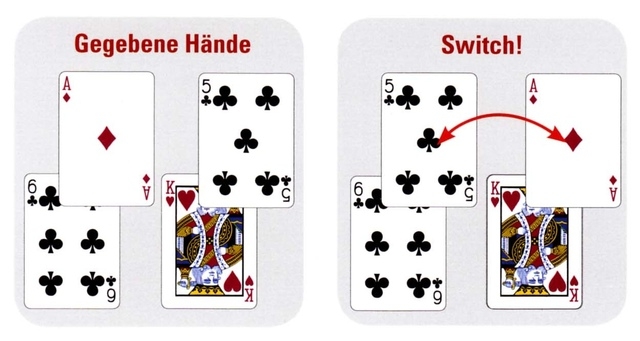 Сначала скажем, что в игре блэкджэк свитч, так же как и в просто блэкджэке, используется шесть колод игральных карт по 52 в каждой. При этом каждая карта в колоде находится в соотношении с определенными номиналами (от двух до десяти очков). Этот числовой номинал свойственен картам с обозначением от двоек до десяток, при этом их номера соответствуют номиналам. Валеты, дамы и короли соответствуют номиналу десяти, а туз, исходя из пожелания игрока, может нести в себе очки от 1 до 10.