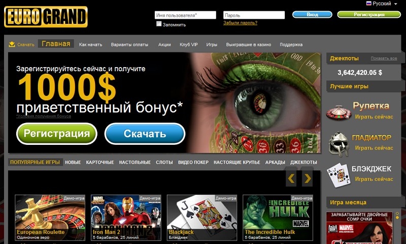 На первый свой депозит новый клиент казино «Еврогранд» может получить до тысячи долларов в качестве бонуса. За второе и третье пополнение счета предусмотрена сумма чуть поменьше, но все же приятная. В рамках реферальной программы приводите в казино своих друзей и также получайте бонусы.