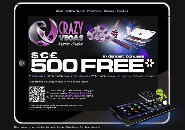На свой первый депозит игрок получает 100% приветственный бонус (но не более 150 долларов). Эту сумму, конечно же, обналичить сразу нельзя, ее нужно отыграть, сделав тридцать ставок. На некоторых слотах новичкам доступен тренировочный режим. После регистрации игроку начисляется ровно час бесплатной игры и фишки на сумму 3 тысячи долларов. Постоянные игроки, участвуя в рейтинговых программах «Crazy Vegas», могут тоже заработать хороший бонус. Рейтинговая программа заведения состоит из четырех уровней. Количество балов, начисляемых игроку, зависит от суммы его ставки. Еженедельно и ежемесячно «Crazy Vegas» проводит различные промо-акции.