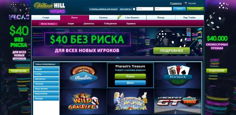 Также не умыкните возможностью получить уникальный бонусы возмещения! Играйте на сорок долларов в любые игры, представленные в William Hill Vegas Casino, а в случае проигрыша казино автоматически вернет Вам эти средства. Играйте в William Hill Vegas Casino без риска!