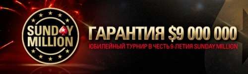 В этом году, на PokerStars пройдет юбилейный турнир Sunday Million – крупнейший оффлайн турнир каждой недели, входящий в расписание большинства профессиональных покерных турниров. Сегодня сумма гарантий составит 9 миллионов долларов! Обычно большинство моих знакомых, в их числе и я, обходили данный турнир стороной и ни разу за всю покерную карьеру даже не зарегистрировались на участие в нем. Но что-то мне подсказывает, что в этом году все должно быть по-другому. А почему бы и нет?!