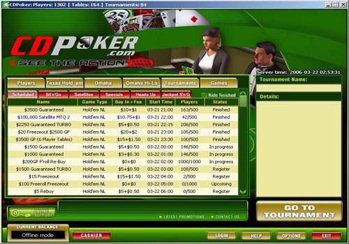 Программа имеет современный красивый интерфейс с красочной и привлекательной графикой. CD Pokerтакже предлагает отличные интегрированные под программное обеспечение казино-игры для игроков, которые хотят немного отдохнуть от покера. Программное обеспечение часто обновляется и имеет отличный цветной интерфейс с привлекательной графикой. Функциональные возможности и пригодность для игры отличные, и прежние незначительные проблемы в программном обеспечении устранены. Предлагаемые игры включают Hold'em, Omaha и Seven-Card Stud Hi, Omaha Hi и Hi-Lo и ринговые игры, а так же один-на-один, сит-энд-гоу и турниры за несколькими столами.