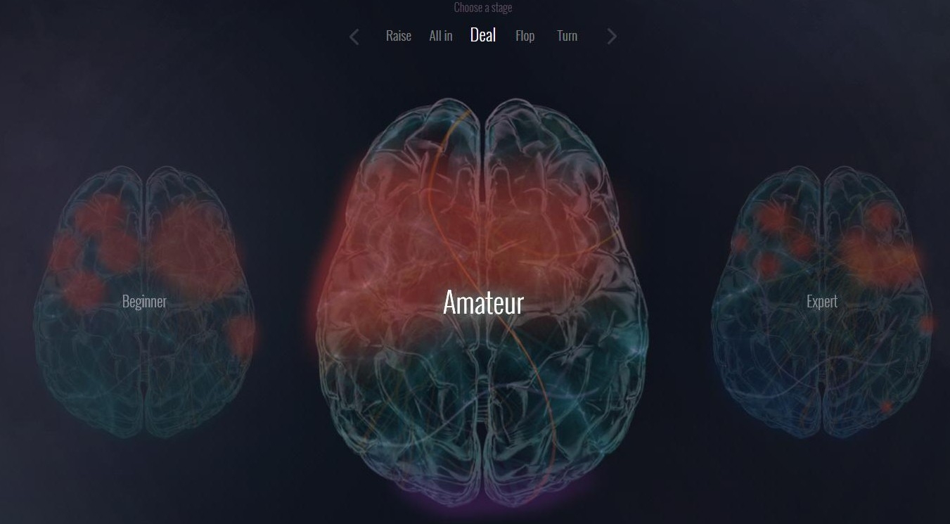 Этому исследованию ученые посвятили отдельный сайт, на котором показан мозг на разных этапах игры в покер. На нем вы можете увидеть, что начинающий игрок, профессиональный игрок и любитель во время раздачи карт, терна, флопа, ривера, и других действий в покере – во время рейза, чека, коллирования и когда все фишки ставятся на кон.