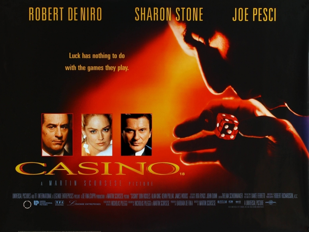 Пожалуй, со всех этих фильмов, можно выделить три наиболее удачные и в мире кинематографа. Наш список возглавляет великий фильм легендарного режиссера Мартина Скорсезе – «Казино». Главные роли в нем исполнили всеми нами любимые актеры - Роберт Де Ниро и Шэрон Стоун. А сам слоган фильма может служить и слоганом всем азартным играм, и звучит он, как - «Риск. Власть. Искушение.». Мир Лас-Вегаса, казино и водопад денег, что льется в карманах гангстеров.