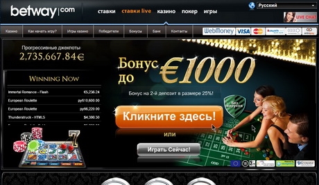 Главная страница официального сайта казино «Betway» имеет очень привлекательный вид, хотя и представлена в темных цветах. Также как и во всех остальных виртуальных казино, необходимо пройти обычную систему регистрации, затем совершить депозитный взнос, бонус при этом либо можно использовать, либо можно отказаться от него.