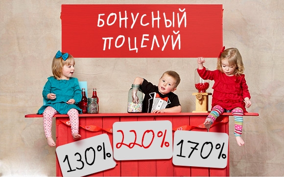 Вносите депозиты от 10 долларов и получайте в подарок супер бонусы! 130% за пополнение от 10 долларов, 170% за пополнение от 30 долларов и 220% за депозит от 50 долларов. Не упустите шанс получить максимальное поощрение, которое достигает 350 долларов. Совершайте крупные депозиты и будьте уверены, что дополнительные денежные премии принесут Вам невероятную удачу и гигантские денежные суммы!