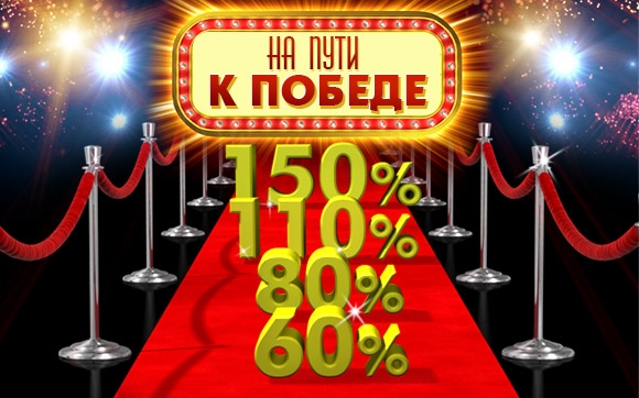 Пополните счет на 1$ и более чтобы получить 60%, за депозиты от 5$ мы подарим 80%, пополните счет на сумму от 20$ и активируйте бонус 110%, а чтобы получить бонус 150% игроку нужно сделать депозит от 50$! В итоге без особого труда вы можете получить до 300$ в подарок! Акция будет проходить с 9 про 11 мая.
