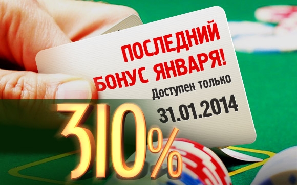Неожиданное предложение от Твист Казино! Только 31.01.14 Вы можете получить поистине огромный бонус в размере 310% в рамках супер акции "Последний бонус Января"! Бонус 310% будет начислен на каждый депозит от 10 центов и выше.