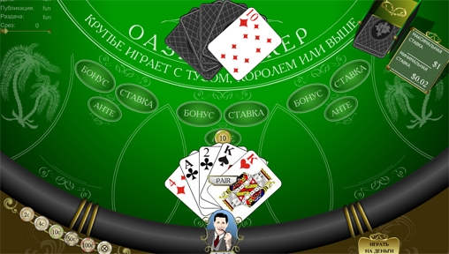 Общее описание игры Оазис Покер очень просто и незатейливо. Принцип ее состоит в том, чтобы игрок, на свой страх и риск, принял решение, что ему делать с картами. Да, звучит несколько смешно, но это именно так. Вот представьте себе карточный покерный стол, на котором лежат десять карт, пять у игрока и пять у дилера. При этом игрок видит четыре карты крупье. И теперь его задача сделать правильный ход, один из трех возможных, а именно, либо сбросить карты, либо их поменять или же сделать ставку. Если игрок принимает решение сбросить карты, ему приходится раскошелиться, ведь каждая замененная карта обойдется ему в один Анте.