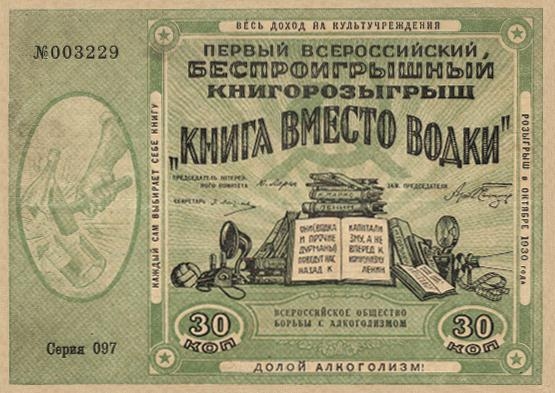 Антиалкогольная лотерея была создана в 1929 году. Призами в этой лотерее были не деньги, а книги. Лотерея была беспроигрышной, каждый участник получал приз. Таким образом, пытались отвлечь от алкогольной зависимости.