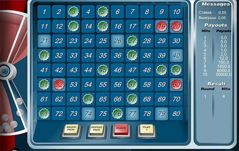 Шарики для пинг-понга с нумерацией от 1-80 засыпаются в барабан. В случайном порядке с барабана достается 20 шаров. Основная задача игры состоит в том, что бы отмеченные вами номера совпали с теми, то достали из барабана. В реальном розыгрыше лотереи, выигрышные шары из барабана достает крупье, в свою очередь при розыгрыше в интернет-казино вместо крупье это делает генератор случайных чисел.