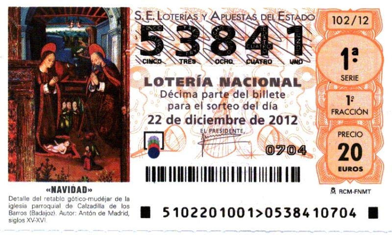 Вот так лотерея поддерживает связь между обществом и культурой страны. В 2013 году Экстраординарная ничья составила 84 млн. евро, premio особенный был равен 5 миллионам. Игра проводилась к 750-ой годовщине объединения El Sabio короля Альфонсо X города Херес.