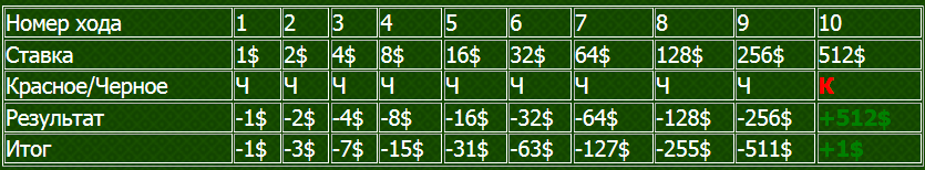 Чтобы начать игру, игрок должен выбрать любые понравившиеся ему семь чисел из тридцати шести, которые представлены на игровом поле рулетки. В начале игры делается ставка одинакового размера на все эти выбранные семь цифр. Я рекомендую начинать Вам с размера ставки в один доллар. Затем игрок должен действовать строго по определенной схеме, которая представлена в виде специально разработанной игровой таблицы, которую Вы должны изучить, понять и как бы пропустить через себя. Все же перед тем, как начинать эту явно рисковую игру, я рекомендую Вам хорошенько подумать и свесить все «за» и «против» этой игры. Если Вы насколько уверенны в своих силах, что готовы рисковать достаточно высокими суммами денег, тогда удачи Вам, и пусть Ваш риск будет оправдан! А если Вы хоть немного сомневаетесь, лучше выберите другую игровую стратегию, которая будет менее рискованной и затратной, и получайте от своей игры не только удовольствие, а и солидный денежный доход! Удачи Вам!