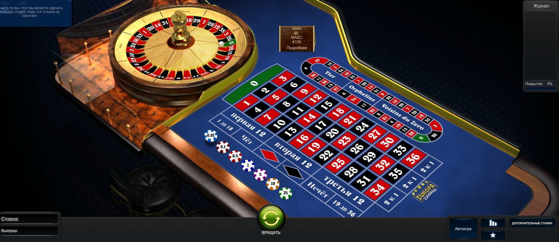 На игру ставки можно сделать сразу несколькими фишками. Обычно, такие фишки идут номиналом от полу доллара до пятисот долларов. Чуть левее есть статистика с недавно выпавшими числами. Также видно два дополнительных поля: с текущей ставкой и с выпавшим выигрышем.
