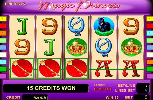 Играть в Magic Princess очень просто, для этого нужно сделать ставку, используя функциональные клавиши Line 1— Line 9, выбираете определенное количество линий и размер ставки. Чем выше ставки и больше линий, тем больше и размер выигрыша. Далее все точно так же, как и в других автоматах серии Гейминатор. Нажимаете на кнопку Старт и погружаетесь в волшебный мир игры, где разнообразные символы выстраиваются в ряды, собираясь в выигрышные комбинации. Раз уж мы заговорили о символах, то следует отметить, что автомат посвящен волшебной тематике, на барабанах можно увидеть самые значимые карточные фигуры. Так, карточные символы 10, J, Q, K и A в комбинации до 5 штук принесет выигрыш, конечно не большой и далекий от основного, но все равно приятный.