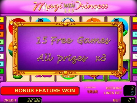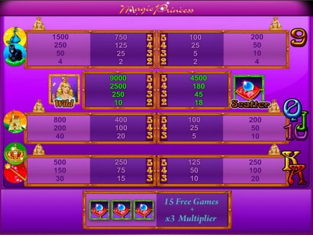Вот более значимым является символ Волшебной палочки, Замка, Короны, не забываем, что это автомат Волшебная принцесса! Самыми дорогими символами являются, как ни странно, символ Черной кошки, Павлина, ну а изображение Принцессы является Диким символом, т.е. джокером. Он может заменять абсолютно любой другой символ на барабане, при этом складывать наиболее выигрышную комбинацию. Отличительно, что игровой автомат Magic Princess имеет две бонусные игры, такую особенность можно увидеть во время игры на Сизлинг Хот или Дельфинах. Первый бонус в нашем автомате – 15 бесплатных переворотов барабанов, которые запускаются тогда, когда на экране совпадет более 3 символов Магического шара, который прозвали Скаттер. Удивительно, но многие не замечали Скаттер в таких автоматах как Бук оф Ра, или Дельфинах, он присущ всем гейминаторам.