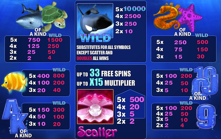 Этот очень красочный и увлекательный игровой автомат посвящен морской тематике. Его главные герои выполнены в виде обитателей морских глубин – рыбок, черепах, ракушек, морских звезд и т.д. Роль «вайлда», то есть символа, который заменяет собой любой другой недостающий до призовой комбинации, отведена касатке. Большую выплату получит тот, кому выпадет кит. Бесплатные спины (33 штуки) может подарить раковина с жемчужиной. Кстати, выигрыш по бесплатным спинам умножается в 2-15 раз.