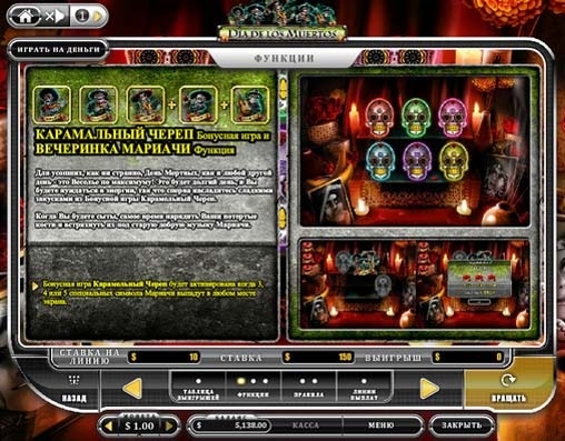 Веселье сулит немалые выигрыши! Первый раунд бонусной игры называется «Карамельный череп». Как раз время перекусить и подзаработать. Перед игроком откроется новое игровое поля с шестью съедобными карамельными черепами. Выбирайте те, которые вам больше по душе и получайте гонорары! Следом за этим этапом, вы перенесетесь в новый раунд под названием «Вечеринка мариачи». Этот раунд принесет вам бесплатные вращения, их количество зависит от того, какую локацию вы выберите. Этот этап бонусной игры может предложить вам максимум пятнадцать фри спинов и максимальный коэффициент, который равен 5.
