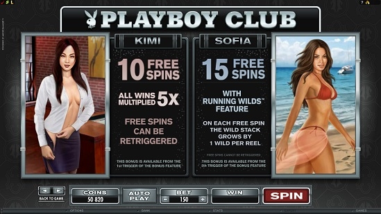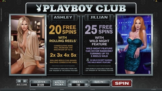 Изначально для игры в клубе доступна только одна девушка (Кими). Она дарит десять бесплатных вращений с множителем, который равен пяти. Для того, чтобы иметь доступ к другим девушкам (а значит и к другим играм) необходимо продолжить игру, становясь постоянным посетителем Плейбой Клаб. Доступ ко второй девушке можно получить после пятого запуска бонусной игры. София принесет вам пятнадцать дополнительных бесплатных вращений. После того, как бонусная игра будет активирована не менее десяти раз, появится новая красотка, Эшли, которая, в свою очередь, активирует двадцать фри спинов. И, наконец, Джиллиан. Встретиться с этой девушкой можно после пятнадцатого запуска бонусной игры. Встреча с Джиллиан принесет двадцать пять дополнительных вращений барабана.