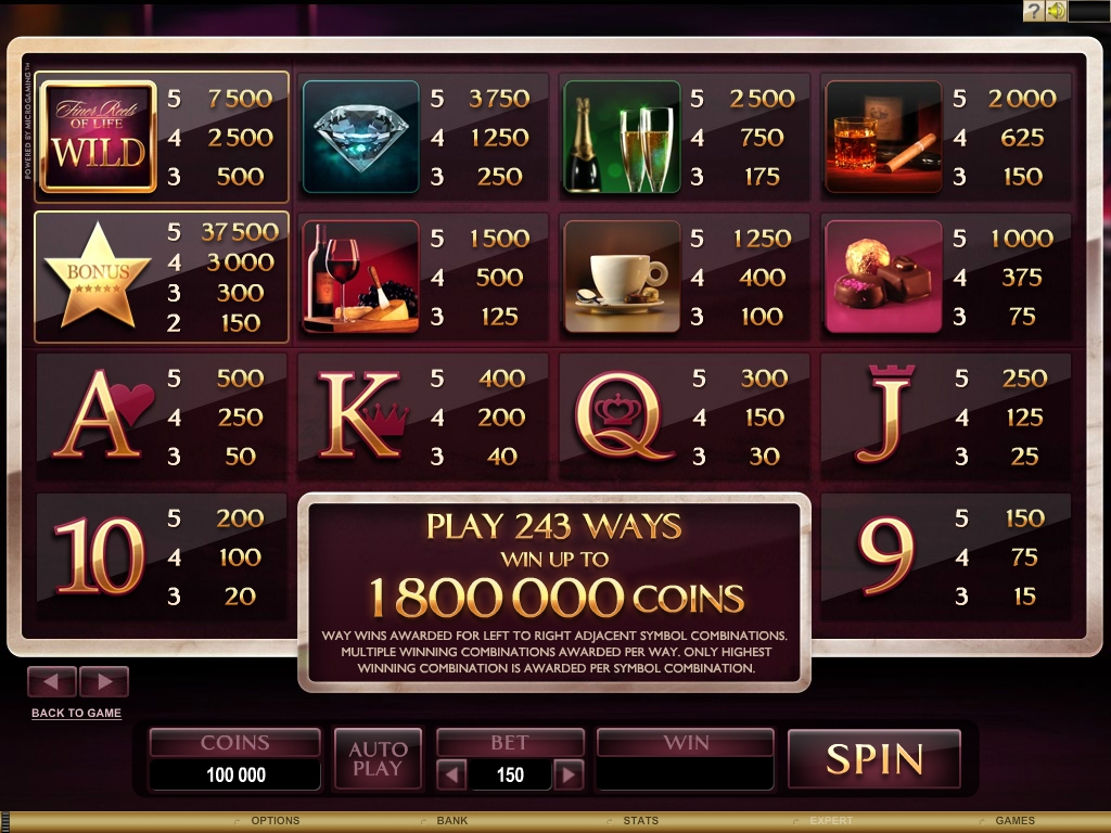 Отправляйтесь в страну роскоши, прекрасных изысканных подарков и вкуснейших блюд вместе с автоматом «The Finer Reels of Life», который был разработан компанией «Микрогейминг». Вам может показаться, что в этой игре нет ничего особенного, но в то же время, у этого слота есть своя отличительная черта: это не просто очередной игровой автомат, это просто таки гастрономический рай!