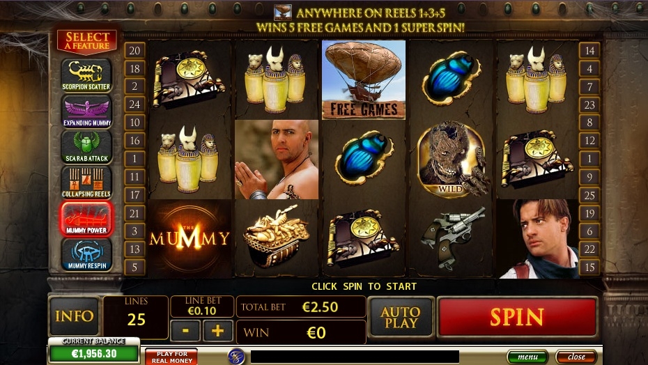Название автомата «Мумия» может натолкнуть вас на мысль, что здесь в очередной раз реализована избитая древнеегипетская тематика. В этой игре вам предстоит встреча с главными героями всемирно известного фильма, главные роли в котором сыграли Brendan Fraser и Rachel Weisz. Поклонники этого фильма сразу же найдут в этой игре символы, которые имеют прямое отношение к вышеупомянутой картине. Здесь присутствуют изображения револьверов, главных персонажей, египетских фигурок, самой мумии и другие. Игра предлагает двадцать пять линий выплат, удобный интерфейс и замечательные звуковые эффекты.