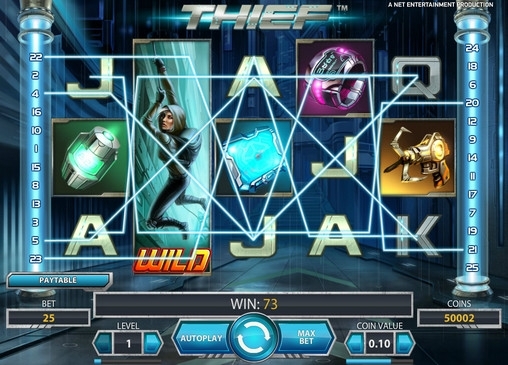 Этот игровой автомат является творением разработчиков Net Entertainment. К вашему вниманию 3D графика, различные визуальные эффекты, высокая динамичность игрового процесса. Theif оснащен пятью барабанами с 25 линиями, а бонусы, дополнительные спины и другие сюрпризы порадуют игрока.