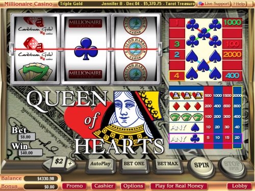 Самыми частыми посетителя казино и преданными игроками этого автомата являются представительницы слабого пола. Видеослот Queen of Hearts создан по стандартной схеме, которая имеет 5 барабанов и 9 игровых линий. Наиболее прибыльным является символ сердца, если вам удастся собрать 5 сердец на одной игровой линии, то считайте, что ваш выигрыш увеличился на 10 000 кредитов. В этом игровом автомате есть и игра на удвоение, которая так же представлена классической схемой – нужно угадать масть карты, подобно автомату Шарки. Только представьте, как может увеличиться ваш выигрыш с игрой на удвоение. К тому же, число бонусных игр длится до того момента, пока автоматически не завершится игра. Вы можете, если повезет, опустошить автомат, выиграв не один десяток тысяч долларов.