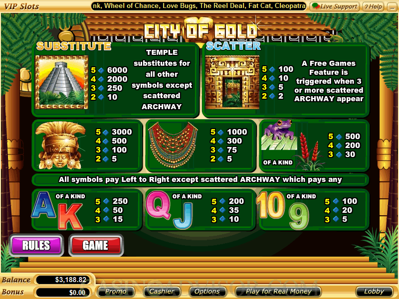 Роль дикого символа в «Городе из золота» отведена изображению Храма. Есть в игре и символ разброса – Арка. Также используются изображения растений, букв, лягушки, подвески, маски, игральных карт.