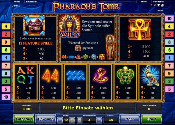 Игровой автомат «Гробница фараона» предлагает своим игрокам проверить свое везение и попробовать выиграть прогрессивный джек-пот. Игра придется по вкусу даже самым искушенным игрокам на автоматах. Игра привлекательна как своим геймплеем, так и звуковым сопровождением, которое создает ощущение абсолютного погружения в атмосферу Древнего Египта. Автомат также отличается приятным трехмерным оформлением, которое выполнено в спокойных и мягких тонах.
