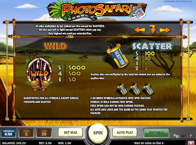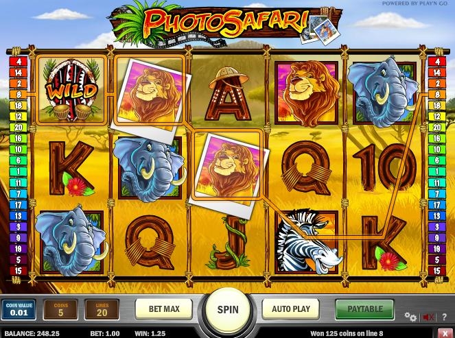 Красочные и немного детские герои, удивительный сюжет, анимации и приятное музыкальное сопровождение, полностью соответствующее тематике «Сафари» - это главные особенности внешнего дизайна игровой машины. Немалых похвал заслуживает и система управления, которая позволит вам с легкостью регулировать и ставку, и риск. С ним легко разберется даже новичок игрищ. Так же этот слот-автомат имеет дополнительные бонусы и разные игры, что не может не радовать. Так же как и в множестве иных игровых слотах, «Photo Safari» предлагает вашему вниманию пять барабанов, которые между собой соединены одной либо двадцатью активными линиями. Конечно же, количество линий определяете вы самостоятельно. Размер ставки для одной такой линии варьирует от одной до пяти монетных единиц, при номинале одной монеты – максимум в двадцать пять центов. Вы и сами понимаете, чем больше будет участвовать игровых линий в игре, тем вероятнее выигрыш; чем больше вы установите количество монет и большим будет их достоинство, тем больше денег вы выиграете, в конечном счете.