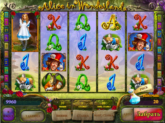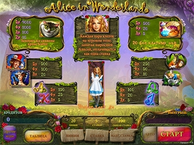 Историю, которая рассказывает об удивительных приключениях девочки Алисы в таинственном Зазеркалье, знает, наверное, каждый образованный челок, вне зависимости от национальности и возраста. Благодаря слоту Алиса в стране чудес у любого игрока появилась возможность не просто оказаться в сказочном мире, но и получить неплохой денежный бонус, если конечно будет выбрана игра на реальные деньги. Естественно данный слот так же предусматривает возможность для бесплатной игры, без малейшего риска потерять свои деньги. Можно получать удовольствие от прекрасной графики, музыкального сопровождения, анимированных персонажей "Алисы в Стране Чудес", которые надолго останутся в памяти игрока.