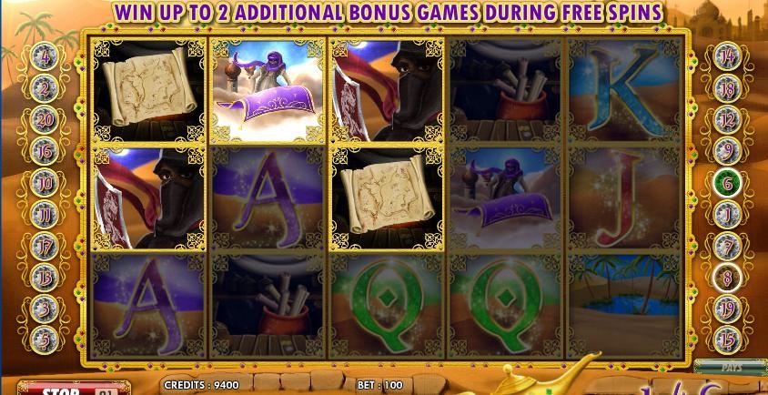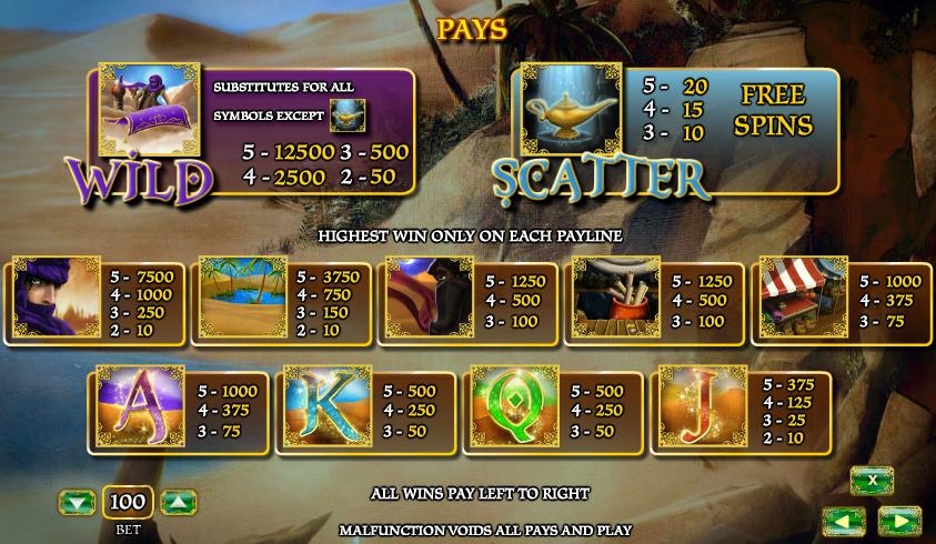 Волшебным символом «разброса» считается «лампа Алладина», который дарит игроку бесплатно двадцать спинов барабана. Кроме этого лампа – это кнопка «старт», которая начинает вращать барабан. Дикий символ игры представлен ковром самолетом и его магические свойства заменяют любой символ, кроме символа «разброса».